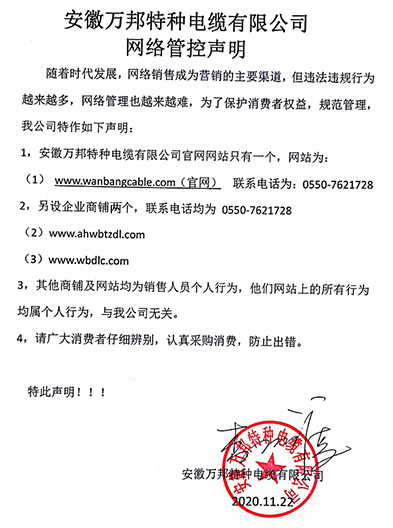 鄭重聲明:安徽萬邦特種電纜有限公司官方網站為:www_wanbangcable_com.littlelove.cn,除此之外無任何子網站或合作網站,其余均為假冒偽劣。電話:0550-7621728 13485756353 地 址:安徽省天長市滁州高新技術產業開發區經四路29號